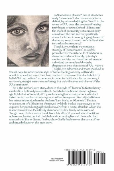 Is Alcoholism a disease? Are alcoholics really "powerless"? Or is the Cult of 12 Steps and the sham of anonymity just conveniently considered the one and only politically correct solution in an ongoing nightmare of shame? And what of Tough Love, with its manipulative strategy of "detachment", widely promoted by the sister cult of AlAnon? For Stella, the Shame Game begins at age 12, labeled as "mentally ill". And stigma follows her into adulthood, when she declares "I am Stella, an Alcoholic". This is a true account of a life almost destroyed by labels. Stella's saga unravels as she explores her past during a physical recovery from a brutal attack and almost murdered. Heartlessly abandoned by her family in the name of Tough Love, Stella makes a break from AA, after 10 years of almost religious adherence, leaving behind the labels and detaching from all those who had created this Shame Game. Find out how Stella finally solves the curse of her addictive behavior in this true story.