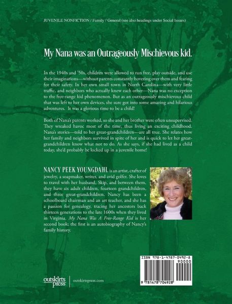 My Nana was an Outrageously Mischievous kid. In the 1940s and '50s, children were allowed to run free, play outside, and use their imaginations-without parents constantly hovering over them and fearing for their safety. In her own small town in North Carolina-with very little traffic, and neighbors who actually knew each other-Nana was no exception to the free-range kid phenomenon. But as an outrageously mischievous child that was left to her own devices, she sure got into some amazing and hilarious adventures. It was a glorious time to be a child! Both of Nana's parents worked, so she and her brother were often unsupervised. They wreaked havoc most of the time, thus living an exciting childhood. Nana's stories-told to her great-grandchildren-are all true. She relates how her family and neighbors survived in spite of her and is quick to let her great-grandchildren know what not to do. As she says, if she had lived as a child today, she'd probably be locked up in a juvenile home!