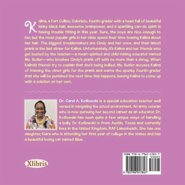 Kalina, a Fort Collins, Colorado, fourth-grader with a head full of beautiful kinky black hair, awesome brainpower, and a sparkling can-do spirit is having trouble fitting in this year. Sure, the boys are nice enough to her, but the most popular girls in her class spend their time teasing Kalina about her hair. The biggest troublemakers are Cindy and her crew, and their latest prank is the last straw for Kalina. Unfortunately, it's Kalina and her friends who get busted by the teacher-a mean-spirited and child-hating educator named Ms. Butler-who brushes Cindy's prank off with no more than a shrug. When Kalina's friends try to explain that she's being bullied, Ms. Butler accuses Kalina of framing the other girls for the prank and warns the spunky fourth-grader that she will be punished the next time this happens, leaving Kalina to come up with a solution on her own.