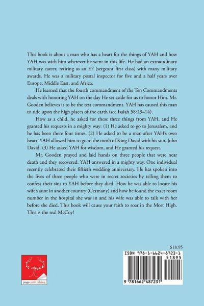This book is about a man who has a heart for the things of YAH and how YAH was with him wherever he went in this life. He had an extraordinary military career, retiring as an E7 (sergeant first class) with many military awards. He was a military postal inspector for five and a half years over Europe, Middle East, and Africa. He learned that the fourth commandment of the Ten Commandments deals with honoring YAH on the day He set aside for us to honor Him. Mr. Gooden believes it to be the test commandment. YAH has caused this man to ride upon the high places of the earth (see Isaiah 58:13-14). How as a child, he asked for these three things from YAH, and He granted his requests in a mighty way: (1) He asked to go to Jerusalem, and he has been there four times. (2) He asked to be a man after YAH's own heart. YAH allowed him to go to the tomb of King David with his son, John David. (3) He asked YAH for wisdom, and He granted his request. Mr. Gooden prayed and laid hands on three people that were near death and they recovered. YAH answered in a mighty way. One individual recently celebrated their fiftieth wedding anniversary. He has spoken into the lives of three people who were in secret societies by telling them to confess their sins to YAH before they died. How he was able to locate his wife's aunt in another country (Germany) and how he found the exact room number in the hospital she was in and his wife was able to talk with her before she died. Here is just one of the stories where he received a word of knowledge to check his car after it had been serviced and found that his brand-new alternator had been stolen. He received a better alternator, and his PCM computer was installed for free. How he was able to find and fix a leak in a waterline buried three to five feet below the ground in a forest of trees. He has many stories to show that YAH has been working in his life. He hopes everyone that reads this book will be blessed by reading it. YAH is alive and so are His Words. When you read this book, it will cause your faith to soar! This isn't false advertisement. This is the real McCoy! This book is offered to YAH as an offering of His goodness to anyone who puts their trust in Him. Mr. Gooden refuses to offer to YAH something that cost him nothing! This book is loaded with many stories of how YAH has worked in this man's life.
