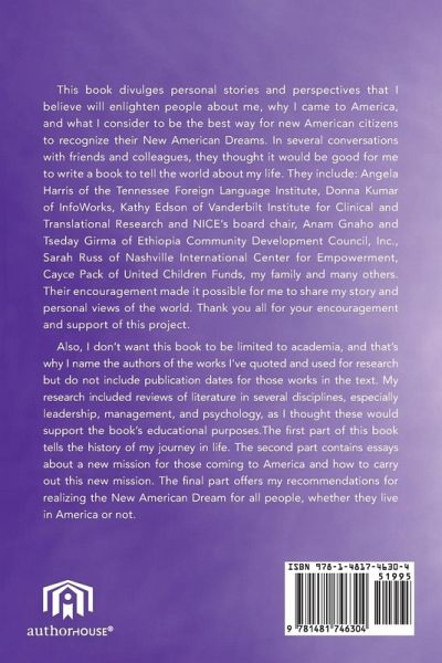 This book divulges personal stories and perspectives that I believe will enlighten people about me, why I came to America, and what I consider to be the best way for new American citizens to recognize their New American Dreams. In several conversations with friends and colleagues, they thought it would be good for me to write a book to tell the world about my life. They include: Angela Harris of the Tennessee Foreign Language Institute, Donna Kumar of InfoWorks, Kathy Edson of Vanderbilt Institute for Clinical and Translational Research and NICE's board chair, Anam Gnaho and Tseday Girma of Ethiopia Community Development Council, Inc., Sarah Russ of Nashville International Center for Empowerment, Cayce Pack of United Children Funds, my family and many others. Their encouragement made it possible for me to share my story and personal views of the world. Thank you all for your encouragement and support of this project. Also, I don't want this book to be limited to academia, and that's why I name the authors of the works I've quoted and used for research but do not include publication dates for those works in the text. My research included reviews of literature in several disciplines, especially leadership, management, and psychology, as I thought these would support the book's educational purposes. The first part of this book tells the history of my journey in life. The second part contains essays about a new mission for those coming to America and how to carry out this new mission. The final part offers my recommendations for realizing the New American Dream for all people, whether they live in America or not.