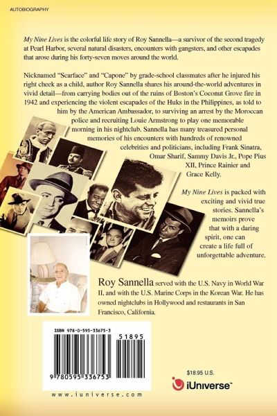 My Nine Lives is the colorful life story of Roy Sannella--a survivor of the second attack on Pearl Harbor, several natural disasters, encounters with gangsters, and other escapades that arose during his forty-seven moves around the world. Nicknamed "Scarface" and "Capone" by grade-school classmates after he injured his right cheek as a child, author Roy Sannella shares his around-the-world adventures in vivid detail--from carrying bodies out of the ruins of Boston's Coconut Grove fire in 1942 and experiencing the violent escapades of the Huks in the Philippines, as told to him by the American Ambassador, to surviving an arrest by the Moroccan police and recruiting Louie Armstrong to play one memorable morning in his nightclub. Sannella has many treasured personal memories of his encounters with hundreds of renowned celebrities and politicians, including Frank Sinatra, Omar Sharif, Sammy Davis Jr., Pope Pius XII, Prince Rainier and Grace Kelly. My Nine Lives is packed with exciting and vivid true stories. Sannella's memoirs prove that with a daring spirit, one can create a life full of unforgettable adventure.