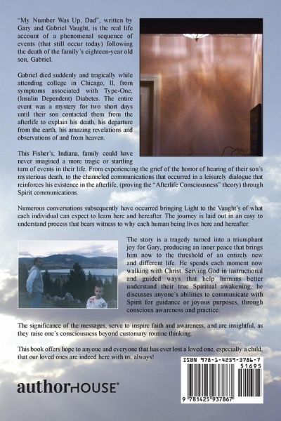 My Number Was Up, Dad", written by Gary and Gabriel Vaught, is the real life account of a phenomenal sequence of events (that still occur today) following the death of the family's eighteen-year old son, Gabriel. Gabriel died suddenly and tragically while attending college in Chicago, Il, from symptoms associated with Type-One, (Insulin Dependent) Diabetes. The entire event was a mystery for two short days until their son contacted them from the afterlife to explain his death, his departure from the earth, his amazing revelations and observations of and from heaven. This Fisher's, Indiana, family could have never imagined a more tragic or startling turn of events in their life. From experiencing the grief of the horror of hearing of their son's mysterious death, to the channeled communications that occurred in a leisurely dialogue that reinforces his existence in the afterlife, (proving the "Afterlife Consciousness" theory) through Spirit communications. Numerous conversations subsequently have occurred bringing Light to the Vaught's of what each individual can expect to learn here and hereafter. The journey is laid out in an easy to understand process that bears witness to why each human being lives here and hereafter. The story is a tragedy turned into a triumphant joy for Gary, producing an inner peace that brings him now to the threshold of an entirely new and different life. He spends each moment now walking with Christ. Serving God in instructional and guided ways that help humans better understand their true Spiritual awakening, he discusses anyone's abilities to communicate with Spirit for guidance or joyous purposes, through conscious awareness and practice. The significance of the messages, serve to inspire faith and awareness, and are insightful, as they raise one's consciousness beyond customary routine thinking. This book offers hope to anyone and everyone that has ever lost a loved one, especially a child, that our loved ones are indeed here with us, always!