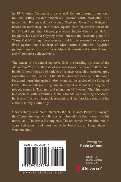 In 1944, when Communism devastated Eastern Europe, it uprooted millions, setting the new Displaced Persons adrift, most often to a tragic fate. By unusual luck, young Stephane Groueff, a Bulgarian, landed on more hospitable shores. Spared from the destruction of his family and home after a happy, privileged childhood in a small Balkan kingdom, his eventful Odyssey threw him into the fascinating life of a Paris-Match foreign correspondent, led him to romantic experiences lived against the backdrop of Montmartre nightclubs, Egyptian pyramids, opulent Irish castles or Alpine ski resorts and involved him in anti-Communist exile activities.