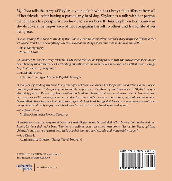 My Pace tells the story of Skylar, a young sloth who has always felt different from all of her friends. After having a particularly hard day, Skylar has a talk with her parents that changes her perspective on how she views herself. Join Skylar on her journey as she discovers the importance of not comparing herself to others and living life at her own pace. "I love reading this book to my daughter! She is a natural competitor, and this story helps me illustrate that while she won't win at everything, she will excel at the things she's purposed to do here on Earth!" -Dana Montgomery, Mom-In-Chief "As a father, this book is very relatable. Kids are so focused on trying to fit in with the crowd when they should be embracing their differences. Celebrating our differences is what makes us all special, and that is the message I try to drill into my daughter." -Dondi McGowan, Retail Accounting & Accounts Payable Manager "I really enjoy reading this book to my three-year-old son. He loves all of the pictures and relates to the story in more ways than one. I always express to him the importance of embracing his differences, so Skylar's story is absolutely perfect. Raven may have written this book for children, but we can all learn from it. No matter our age or season of life we may be in, we need to love one another, as well as ourselves, and embrace the unique, God-crafted characteristics that make us all special. This book brings that lesson to a level that my child can comprehend and really enjoy! It's a book that he can relate to and read again and again!" -Stephanie Epps, Mother, Gymnastics Coach, Caregiver "I encourage everyone to go on this journey with Skylar as she is reminded of her beauty, both inside and out. I think Skylar's dad said it best: 'Everyone is different and wears their own crown.' Enjoy this fresh, uplifting children's story as you remind your little one that they too are fearfully and wonderfully made."-Joy Kincade, Administrative Director (Nurses Travel Network)