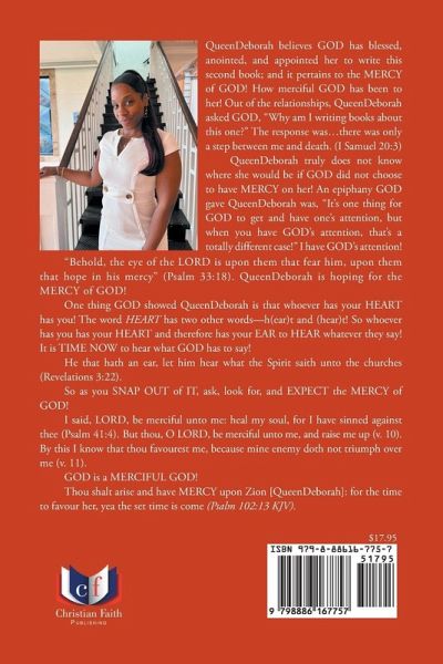 QueenDeborah believes God has blessed, anointed, and appointed her to write this second book; and it pertains to the mercy of God! How merciful God has been to her! Out of the relationships, QueenDeborah asked God, "Why am I writing books about this one?" The response was...there was only a step between me and death. (I Samuel 20:3) QueenDeborah truly does not know where she would be if God did not choose to have mercy on her! An epiphany God gave QueenDeborah was, "It's one thing for God to get and have one's attention, but when you have God's attention, that's a totally different case!" I have God's attention! "Behold, the eye of the Lord is upon them that fear him, upon them that hope in his mercy" (Psalm 33:18). QueenDeborah is hoping for the mercy of God! One thing God showed QueenDeborah is that whoever has your heart has you! The word heart has two other words--h(ear)t and (hear)t! So whoever has you has your heart and therefore has your ear to hear whatever they say! It is time now to hear what God has to say! He that hath an ear, let him hear what the Spirit saith unto the churches (Revelations 3:22). So as you snap out of it, ask, look for, and expect the mercy of God! I said, Lord, be merciful unto me: heal my soul, for I have sinned against thee (Psalm 41:4). But thou, O Lord, be merciful unto me, and raise me up (v. 10). By this I know that thou favourest me, because mine enemy doth not triumph over me (v. 11). God is a merciful God! Thou shalt arise and have mercy upon Zion [QueenDeborah]: for the time to favour her, yea the set time is come (Psalm 102:13 KJV).