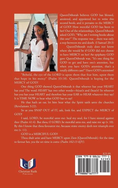 QueenDeborah believes God has blessed, anointed, and appointed her to write this second book; and it pertains to the mercy of God! How merciful God has been to her! Out of the relationships, QueenDeborah asked God, "Why am I writing books about this one?" The response was...there was only a step between me and death. (I Samuel 20:3) QueenDeborah truly does not know where she would be if God did not choose to have mercy on her! An epiphany God gave QueenDeborah was, "It's one thing for God to get and have one's attention, but when you have God's attention, that's a totally different case!" I have God's attention! "Behold, the eye of the Lord is upon them that fear him, upon them that hope in his mercy" (Psalm 33:18). QueenDeborah is hoping for the mercy of God! One thing God showed QueenDeborah is that whoever has your heart has you! The word heart has two other words--h(ear)t and (hear)t! So whoever has you has your heart and therefore has your ear to hear whatever they say! It is time now to hear what God has to say! He that hath an ear, let him hear what the Spirit saith unto the churches (Revelations 3:22). So as you snap out of it, ask, look for, and expect the mercy of God! I said, Lord, be merciful unto me: heal my soul, for I have sinned against thee (Psalm 41:4). But thou, O Lord, be merciful unto me, and raise me up (v. 10). By this I know that thou favourest me, because mine enemy doth not triumph over me (v. 11). God is a merciful God! Thou shalt arise and have mercy upon Zion [QueenDeborah]: for the time to favour her, yea the set time is come (Psalm 102:13 KJV).