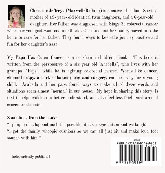My Papa Has Colon Cancer is a non-fiction children's book. This book is written from the eyes of a granddaughter who lives with her grandpa while he is fighting colorectal cancer. Words like cancer, chemotherapy, port, surgery, hospital, and colostomy bag can be confusing for a child to understand. Witnessing it all first hand, can be very scary for a young child, just as it can be for an adult. Arabella and her Papa found funny ways to make all of these words and situations seem almost "normal" in our house. My hope, is that sharing our positive journey in colorectal cancer, helps children to be less frightened about cancer, and instead, enjoy the time that they have with their loved ones. I hope this true story gives some ideas of how to make it memorable and fun!