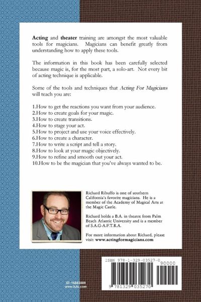 Acting and theater training are amongst the most valuable tools for magicians. Magicians can benefit greatly from understanding how to apply these tools. The information in this book was carefully selected because magic is, for the most part, a solo-art. Not every bit of acting technique is applicable. Some of the tools and techniques that this book will teach you are: 1. How to get the reactions you want from your audience. 2. How to create goals for your magic. 3. How to create transitions. 4. How to stage your act. 5. How to project and use your voice effectively. 6. How to create a character. 7. How to write a script and tell a story. 8. How to look at your magic objectively. 9. How to refine and smooth out your act. 10. How to be the magician that you've always wanted to be.