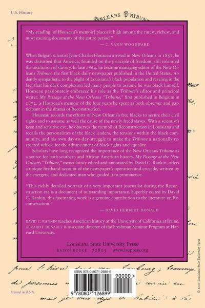 When Belgian scientist Jean-Charles Houzeau arrived in New Orleans in 1857, he was disturbed that America, founded on the principle of freedom, still tolerated the institution of slavery. In late 1864, he became managing editor of the New Orleans Tribune, the first black daily newspaper published in the United States. Ardently sympathetic to the plight of Louisiana's black population and reveling in the fact that his dark complexion led many people to assume he was black himself, Houzeau passionately embraced his role as the Tribune's editor and principal writer. My Passage at the New Orleans "Tribune," first published in Belgium in 1872, is Houzeau's memoir of the four years he spent as both ob-server and participant in the drama of Reconstruction. Houzeau records the efforts of New Orleans's free blacks to secure their civil rights and to assume as well the cause of the newly freed slaves. With a scientist's keen and sensitive eye, he observes the turmoil of Reconstruction in Louisiana and recalls the per-sonalities of the black leaders, the tensions within the black community, and his own day-to-day struggle to make the Tribune a nationally respected vehicle for the advancement of black rights and equality. Scholars have long recognized the importance of the New Orleans Tribune as a source for both southern and African American history. My Passage at the New Orleans "Tribune," meticulously edited and annotated by David C. Rankin, offers a unique firsthand account of the newspaper's operation and crusade, written by the energetic and dedicated man who guided it to prominence.