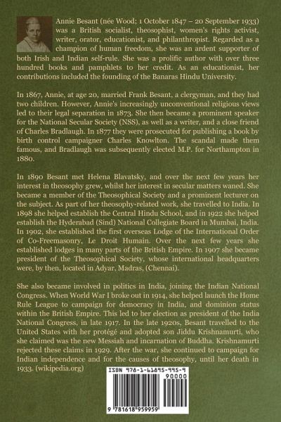 Annie Besant (née Wood; 1 October 1847 - 20 September 1933) was a British socialist, theosophist, women's rights activist, writer, orator, educationist, and philanthropist. Regarded as a champion of human freedom, she was an ardent supporter of both Irish and Indian self-rule. She was a prolific author with over three hundred books and pamphlets to her credit. As an educationist, her contributions included the founding of the Banaras Hindu University. In 1867, Annie, at age 20, married Frank Besant, a clergyman, and they had two children. However, Annie's increasingly unconventional religious views led to their legal separation in 1873. She then became a prominent speaker for the National Secular Society (NSS), as well as a writer, and a close friend of Charles Bradlaugh. In 1877 they were prosecuted for publishing a book by birth control campaigner Charles Knowlton. The scandal made them famous, and Bradlaugh was subsequently elected M.P. for Northampton in 1880. In 1890 Besant met Helena Blavatsky, and over the next few years her interest in theosophy grew, whilst her interest in secular matters waned. She became a member of the Theosophical Society and a prominent lecturer on the subject. As part of her theosophy-related work, she travelled to India. In 1898 she helped establish the Central Hindu School, and in 1922 she helped establish the Hyderabad (Sind) National Collegiate Board in Mumbai, India. In 1902, she established the first overseas Lodge of the International Order of Co-Freemasonry, Le Droit Humain. Over the next few years she established lodges in many parts of the British Empire. In 1907 she became president of the Theosophical Society, whose international headquarters were, by then, located in Adyar, Madras, (Chennai). She also became involved in politics in India, joining the Indian National Congress. When World War I broke out in 1914, she helped launch the Home Rule League to campaign for democracy in India, and dominion status within the British Empire. This led to her election as president of the India National Congress, in late 1917. In the late 1920s, Besant travelled to the United States with her protégé and adopted son Jiddu Krishnamurti, who she claimed was the new Messiah and incarnation of Buddha. Krishnamurti rejected these claims in 1929. After the war, she continued to campaign for Indian independence and for the causes of theosophy, until her death in 1933. (wikipedia.org)