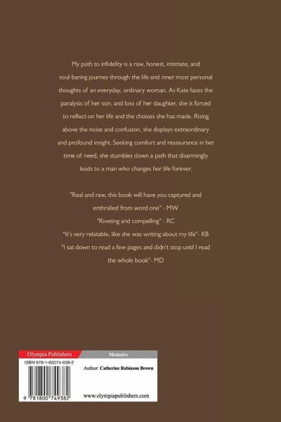 My path to infidelity is a raw, honest, intimate, and soul-baring journey through the life and inner most personal thoughts of an everyday, ordinary woman. As Kate faces the paralysis of her son, and loss of her daughter, she is forced to reflect on her life and the choices she has made. Rising above the noise and confusion, she displays extraordinary and profound insight. Seeking comfort and reassurance in her time of need, she stumbles down a path that disarmingly leads to a man who changes her life forever. "Real and raw, this book will have you captured and enthralled from word one" - MW "Riveting and compelling" - RC "It's very relatable, like she was writing about my life"- KB "I sat down to read a few pages and didn't stop until I read the whole book"- MD