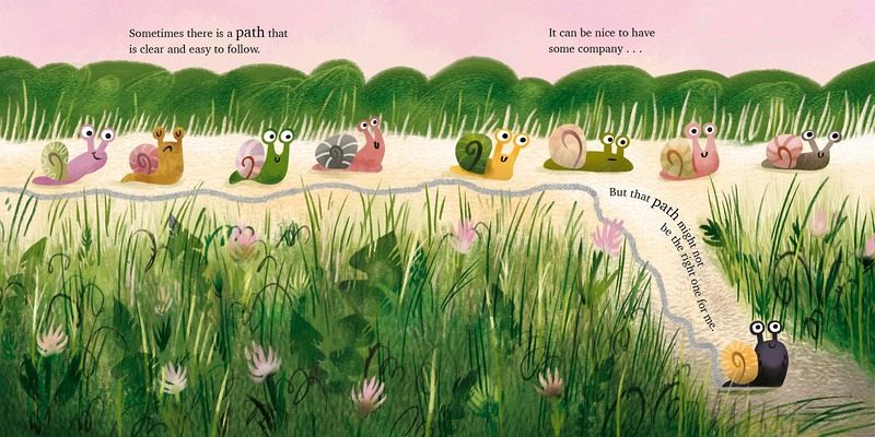 A joyful, empowering celebration of finding your path with an adorable snail protagonist— follow the snail's sparkly silver trail on every page! In this charmingly illustrated picture book, a little snail sets off to find its path. There are mountains to climb, rushing rivers to cross, and sometimes the journey ahead seems impossible. But listening to their inner voice, this determined snail keeps going. Follow this adventurous snail as they decide not to follow the crowd and face unexpected challenges. This inspiring journey will help young readers see that even the smallest creature can find their unique way forward.