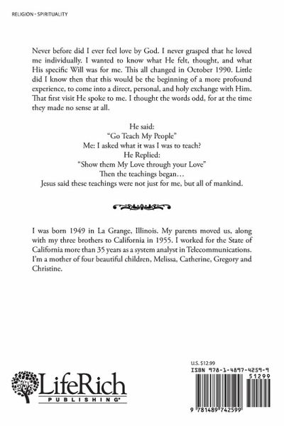 Never before did I ever feel love by God. I never grasped that he loved me individually. I wanted to know what He felt, thought, and what His specific Will was for me. This all changed in October 1990. Little did I know then that this would be the beginning of a more profound experience, to come into a direct, personal, and holy exchange with Him. That first visit He spoke to me. I thought the words odd, for at the time they made no sense at all. He said: "Go Teach My People" Me: I asked what it was I was to teach? He Replied: "Show them My Love through your Love" Then the teachings began... Jesus said these teachings were not just for me, but all of mankind.