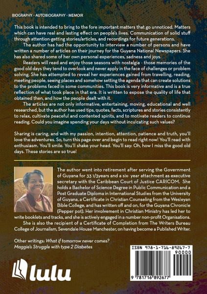 This book is intended to bring to the fore important matters that go unnoticed. Matters which can have real and lasting effect on people's lives. Communication of solid stuff through attention-getting stories/articles, and recordings for future generations. The author has had the opportunity to interview a number of persons and have written a number of articles on their journey for the Guyana National Newspapers. She has also shared some of her own personal experiences, sadness and joys. Readers will read and enjoy those seasons with nostalgia - those memories of the good old days they tend to overlook and never apply in the face of challenges or problem solving. She has attempted to reveal her experiences gained from travelling, reading, meeting people, seeing places and somehow setting the agenda that can create solutions to the problems faced in some communities. This book is very informative and is a true reflection of what took place in that era. It is written to expose the quality of life that obtained then, and how the people dealt with it. The articles are not only informative, entertaining, moving, educational and well researched, but the author has used tips, quotes, facts, scriptures and stories consistently to relax, cultivate peaceful and contented spirits, and to motivate readers to continue reading. Could you imagine spending your days without inculcating such values? Sharing is caring, and with my passion, intention, attention, patience and truth, you'll love the adventures. So, turn this page over and begin to read right now! You'll read with enthusiasm. You'll smile. You'll shake your head. You'll say: Oh, how I miss the good old days. These stories are so true!
