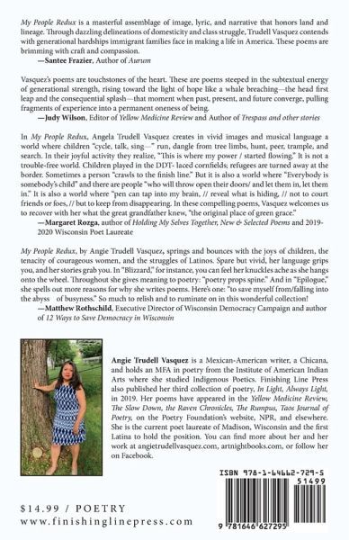 The poems in the collection, "My People Redux," travel through time. We go back and forth between the present, "They Could Be Sisters," and the past, "Goose Eggs," not just the poet's past but that of her ancestors who came to the Midwest from Mexico in the late 1800s, as displayed in the piece, "My People Redux." The poet's voice is always female and strong, but also vulnerable as in the poem, "Child Pose Cannot Hold." These are poems of race, ethnicity, gender, and class. There are also mystical poems in this collection and things the poet cannot explain like in the piece, "Once in Seattle" and in "The Congregation." In Trudell Vasquez's fourth collection her concerns are the same as in all of her previous collections but her way of approaching the page varies. The poet travels in this collection: from Madison to Seattle, Santa Fe, Des Moines, Milwaukee, Washington D.C., Chicago, and outside of the country too, to the Caribbean to Isla Mujeres in Mexico. In the poem, "Everybody is Somebody's Child," we are given a glimpse of the poet's concern for all people across the globe. Ever present in all the work is nature, the poet's appreciation for the natural world and all its creatures, but especially the least fortunate among us.
