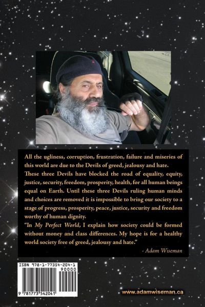 All the ugliness, corruption, frustration, failure and miseries of this world are due to the Devils of greed, jealousy and hate. These three Devils have blocked the road of equality, equity, justice, security, freedom, prosperity, health, for all human beings equal on Earth. Until these three Devils ruling human minds and choices are removed it is impossible to bring our society to a stage of progress, prosperity, peace, justice, security and freedom worthy of human dignity. "In My Perfect World, I explain how society could be formed without money and class differences. My hope is for a healthy world society free of greed, jealousy and hate." - Adam Wiseman
