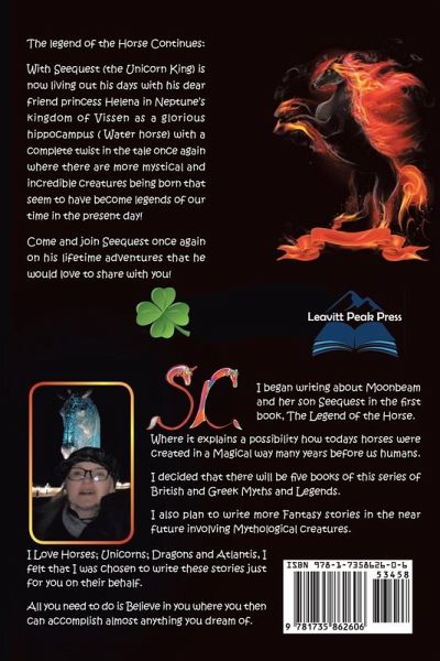 The legend of the Horse Continues:With Seequest (the Unicorn King) is now living out is days with his dear friend princess Helena in Neptune's kingdom of Vissen as a glorious hippocampus ( Water horse) with a complete twist in the tale once again where there are more mystical and incredible creatures being born that seem to have become legends of our time in the present day!Come and join Seequest once again on his lifetime adventures that he would love to share with you!
