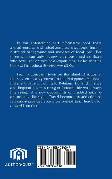 In this entertaining and informative book there are adventures and misadventures, anecdotes, humor, historical background and snatches of local lore. For those who can only journey vicariously and for those who have lived or traveled as expatriates, this fast moving book will introduce My Personal Globe. From a company town on the island of Aruba in the 50's, on to assignments in the Philippines, Malaysia, India and Japan, then Italy, Belgium, Holland, France and England before retiring in Jamaica, life was always interesting. Any new opportunity only added spice to an unsettled life style. Travel becomes an addiction so retirement provided even more possibilities. There's a lot of world out there!