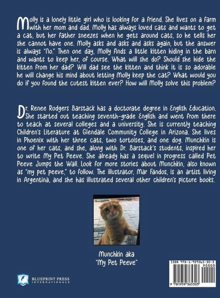 Molly is a lonely little girl who is looking for a friend. She lives on a farm with her mom and dad. Molly has always loved cats and wants to get a cat, but her father sneezes when he gets around cats, so he tells her she cannot have one. Molly asks and asks and asks again, but the answer is always "No." Then one day, Molly finds a little kitten hiding in the barn and wants to keep her, of course. What will she do? Should she hide the kitten from her dad? Will dad see the kitten and think it is so adorable he will change his mind about letting Molly keep the cat? What would you do if you found the cutest kitten ever? How will Molly solve this problem? Dr. Renee Rodgers Barstack has a doctorate degree in English Education. She started out teaching seventh-grade English and went from there to teach at several colleges and a university. She is currently teaching Children's Literature at Glendale Community College in Arizona. She lives in Phoenix with her three cats, two tortoises, and one dog. Munchkin is one of her cats, and she, along with Dr. Barstack's students, inspired her to write My Pet Peeve. She already has a sequel in progress called Pet Peeve Jumps the Wall. Look for more stories about Munchkin, also known as "my pet peeve," to follow. The illustrator, Mar Fandos, is an artist living in Argentina, and she has illustrated several other children's picture books.