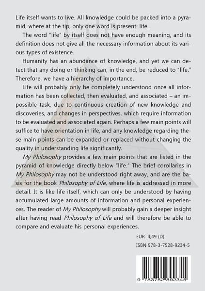 Life itself wants to live. All knowledge could be packed into a pyramid, where at the tip, only one word is present: life.The word "life" by itself does not have enough meaning, and its definition does not give all the necessary information about its various types of existence.Humanity has an abundance of knowledge, and yet we can detect that any doing or thinking can, in the end, be reduced to "life." Therefore, we have a hierarchy of importance.Life will probably only be completely understood once all information has been collected, then evaluated, and associated - an impossible task, due to continuous creation of new knowledge and discoveries, and changes in perspectives, which require information to be evaluated and associated again. Perhaps a few main points will suffice to have orientation in life, and any knowledge regarding these main points can be expanded or replaced without changing the quality in understanding life significantly.My Philosophy provides a few main points that are listed in the pyramid of knowledge directly below "life." The brief corollaries in My Philosophy may not be understood right away, and are the basis for the book Philosophy of Life, where life is addressed in more detail. It is like life itself, which can only be understood by having accumulated large amounts of information and personal experiences. The reader of My Philosophy will probably gain a deeper insight after having read Philosophy of Life and will therefore be able to compare and evaluate his personal experiences.