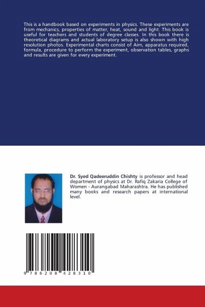 This is a handbook based on experiments in physics. These experiments are from mechanics, properties of matter, heat, sound and light. This book is useful for teachers and students of degree classes. In this book there is theoretical diagrams and actual laboratory setup is also shown with high resolution photos. Experimental charts consist of Aim, apparatus required, formula, procedure to perform the experiment, observation tables, graphs and results are given for every experiment.