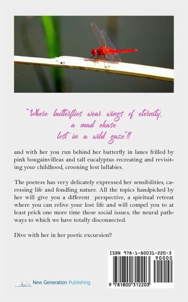 "Where butterflies wear wings of eternity, a mad chase lost in a wild gaze"!! and with her you run behind her butterfly in lanes frilled by pink bougainvilleas and tall eucalyptus recreating and revisiting your childhood, crooning lost lullabies. The poetess has very delicately expressed her sensibilities, caressing life and fondling nature. All the topics handpicked by her will give you a different perspective, a spiritual retreat where you can relive your lost life and will compel you to at least prick one more time those social issues, the neural pathways to which we have totally disconnected. Dive with her in her poetic excursion!!