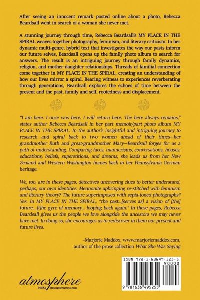 "I am here. I once was here. I will return here. The here always remains," states author Rebecca Beardsall in her part memoir/part photo album My Place in the Spiral. In the author's insightful and intriguing journey to research and spiral back to two women ahead of their times-her grandmother Ruth and great-grandmother Mary-Beardsall forges for us a path of understanding. Comparing faces, mannerisms, conversations, houses, educations, beliefs, superstitions, and dreams, she leads us from her New Zealand and Western Washington homes back to her Pennsylvania German heritage. We, too, are in these pages, detectives uncovering clues to better understand, perhaps, our own identities. Mennonite upbringing re-stitched with feminism and literary theory? The future superimposed with sepia-toned photographs? Yes. In My Place in the Spiral, "the past...[serves as] a vision of [the] future....[t]he gyre of memory... looping back again." In these pages, Rebecca Beardsall gives us the people we love alongside the ancestors we may never have met. In doing so, she encourages us to rediscover in them our present and future lives. -Marjorie Maddox, www.marjoriemaddox.com, author of the prose collection What She Was Saying Through Beardsall's use of photographs and narrative captions, it's as if we have all been invited to an intimate family slideshow. My Place in the Spiral begins with a look at time, at memory, and at our place in all of it and ends with the satisfaction that Beardsall has found herself, her nana, and her great-grandmother connected in the those spiraled lines that are always retreating and returning all at once. Rebecca Beardsall's quest to find out how and why she has always connected with her nana and great-grandmother is a literary journey through photographs and travel. With each turn of the page, we see what she sees, the closing of the distant connection between two women she had always wanted to meet but couldn't and the warmth that grows inside of her with every discovery that she is more like them than she could have imagined. -Kase Johnstun, http://kasejohnstun.com/, author of Beyond the Grip of Craniosynostosis My Place in the Spiral is ostensibly about her search to find out something about her grandmother. And it is that, and that simple story is interesting enough in its own right. But it's also about more far more than that. Through photographs and footnotes, the book asks us to suspend ourselves in multiple moments in the same moment, to see one body in multiple bodies (or is it multiple bodies in one body) and, in doing so, to confront any number of quietly sublime truths about our complicated relationship to time. At various points, the book reminded me of Mitchell, Vonnegut, and Dickens; yet the book goes beyond those now dusty meditations on time to propose yet a new relationship to time. Beardsall uses family history to bend time back on itself so effortlessly. The story runs through your hand a bit like sunlight or cold river water or time itself: beautiful, important, impossible to capture or contain, let alone describe. Readers will find themselves in My Place in the Spiral, I think, because we have all looked into a mirror and watched an unexpected ancestor peer back out. Time does not progress. It swirls. It eddies. It flows faster. Sometimes it stops, even doubles back on itself. -Nathan R. Elliott, Ph.D , writeronabike.online Memoir takes a visual, time-traveling and always intriguing interpretation as Rebecca Beardsall's book crisscrosses family, history and destiny in sometimes startling discoveries that inspire further exploration of the mysteries in one's own memories. -Sarah Eden Wallace, multimedia journalist, Falling Star Studio