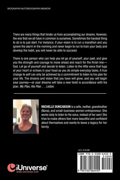 There are many things that hinder us from accomplishing our dreams. However, the one that we all have in common is ourselves. Sometimes the hardest thing to do is to just start. For instance, if your vision is to run a marathon and you ignore the alarm in the morning and never begin to run to train your body and develop the habit, you will never be able to succeed. There is one person who can help you let go of yourself, your past, and give you the strength and courage to move ahead and reach for the finish line-God. Let go of yourself and decide to listen. Listen to the little voice that tugs at your heart or echoes in your head as you do simple everyday tasks. A true change to self can only be achieved by a commitment to listen to his plan for your life. The dreams and vision that you have will grow, and you will begin your journey-or your dreams will take a new twist in accordance with his plan. My Plan, His Plan . . . Listen.
