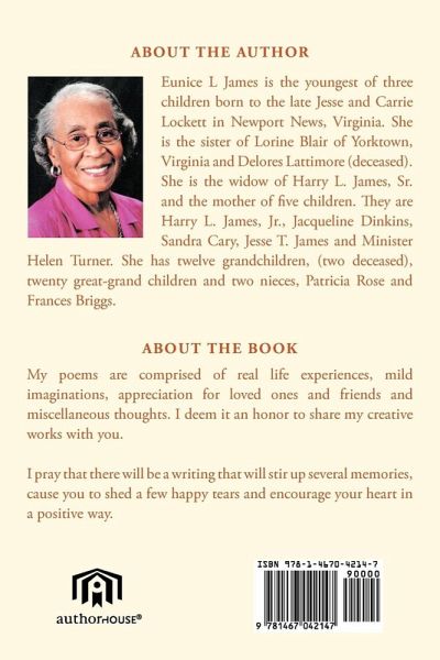 My poems are comprised of real life experiences, mild imaginations, appreciation for loved ones and friends and power- packed, life changing, inspired thoughts.