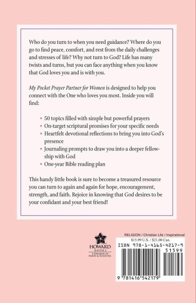 Who do you turn to when you need guidance? Where do you go to find peace, comfort, and rest from the daily challenges and stresses of life? Why not turn to God? Life has many twists and turns, but you can face anything when you know that God loves you and is with you. My Pocket Prayer Partner for Women is designed to help you connect with the One who loves you most. Inside you will find: * 50 topics filled with simple but powerful prayers * On-target scriptural promises for your specific needs * Heartfelt devotional reflections to bring you into God¹s presence * Journaling prompts to draw you into a deeper fellowship with God * One-year Bible reading plan This handy little book is sure to become a treasured resource you can turn to again and again for hope, encouragement, strength, and faith. Rejoice in knowing that God desires to be your confidant and your best friend!