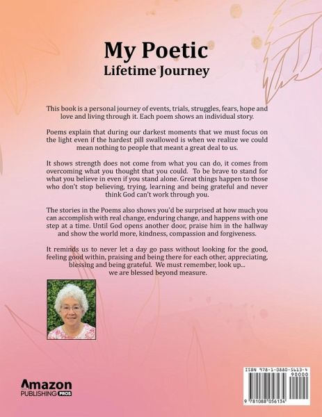 This book is a personal journey of events, trials, struggles, fears, hope and love and living through it. Each poem shows an individual story. Poems explain that during our darkest moments that we must focus on the light even if the hardest pill swallowed is when we realize we could mean nothing to people that meant a great deal to us. It shows strength does not come from what you can do, it comes from overcoming what you thought that you could. To be brave to stand for what you believe in even if you stand alone. Great things happen to those who don't stop believing, trying, learning and being grateful and never think God can't work through you. The stories in the Poems also shows you'd be surprised at how much you can accomplish with real change, enduring change, and happens with one step at a time. Until God opens another door, praise him in the hallway and show the world more, kindness, compassion and forgiveness. It reminds us to never let a day go pass without looking for the good, feeling good within, praising and being there for each other, appreciating, blessing and being grateful. We must remember, look up... we are blessed beyond measure.