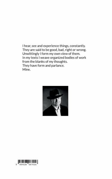 I hear, see and experience things, constantly. They are said to be good, bad, right or wrong. Unwittingly, I form my own view of them. In my texts, I weave organized bodies of work from the blanks of my thoughts. They have form and language. Mine.