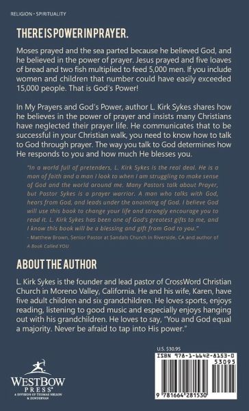 There is power in prayer. Moses prayed and the sea parted because he believed God, and he believed in the power of prayer. Jesus prayed and five loaves of bread and two fish multiplied to feed 5,000 men. If you include women and children that number could have easily exceeded 15,000 people. That is God's Power! In My Prayers and God's Power, author L. Kirk Sykes shares how he believes in the power of prayer and insists many Christians have neglected their prayer life. He communicates that to be successful in your Christian walk, you need to know how to talk to God through prayer. The way you talk to God determines how He responds to you and how much He blesses you. In this insightful book, Bishop Sykes discusses the importance of prayer and provides insight on how to talk to God to receive godly results. He delivers the message that your prayers and God's power will make a difference in your life and in the world.