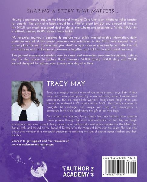 SHARING A STORY THAT MATTERS... Having a premature baby in the Neonatal Intensive Care Unit is an emotional roller coaster for parents. The birth of a baby should be a time of great joy. But any amount of time in the NICU can result in a great deal of stress, overwhelm and uncertainty. While NICU life is difficult, finding HOPE doesn't have to be. My Preemie's Journey is designed to capture your child's medical-related information, daily gratitude and all of the special moments and milestones in the NICU and beyond. It's a sacred place for you to document your child's unique story so your family can reflect on all the obstacles and challenges you overcome together and hold on to each sweet memory. This journal provides a seamless way to share and remember your family's journey with a step by step process to capture those moments. YOUR family, YOUR story and YOUR journal designed to capture your journey one day at a time.