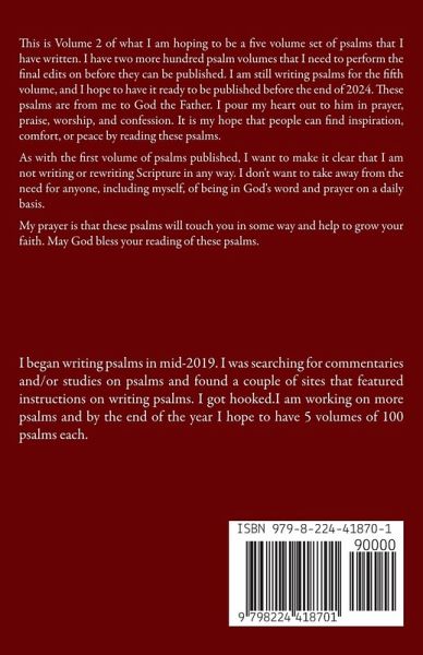 This is Volume 2 of what I am hoping to be a five volume set of psalms that I have written. I have two more hundred psalm volumes that I need to perform the final edits on before they can be published. I am still writing psalms for the fifth volume, and I hope to have it ready to be published before the end of 2024. These psalms are from me to God the Father. I pour my heart out to him in prayer, praise, worship, and confession. It is my hope that people can find inspiration, comfort, or peace by reading these psalms. As with the first volume of psalms published, I want to make it clear that I am not writing or rewriting Scripture in any way. I don't want to take away from the need for anyone, including myself, of being in God's word and prayer on a daily basis. My prayer is that these psalms will touch you in some way and help to grow your faith. May God bless your reading of these psalms.