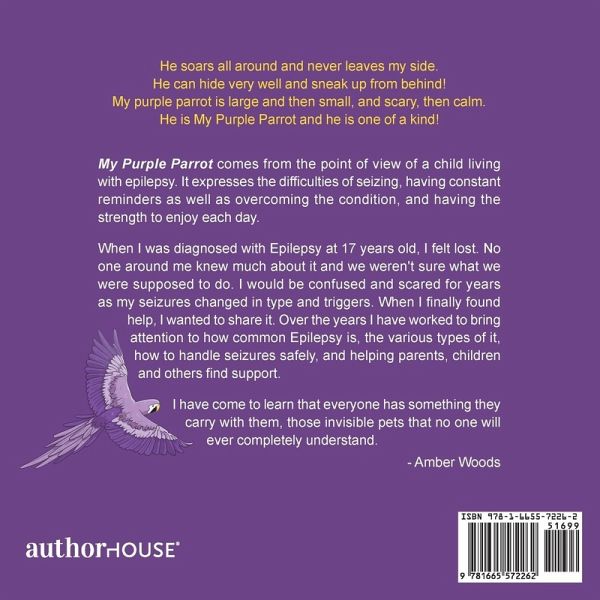 He soars all around and never leaves my side. He can hide very well and sneak up from behind! My purple parrot is large and then small, and scary, then calm. He is My Purple Parrot and he is one of a kind! My Purple Parrot comes from the point of view of a child living with epilepsy. It expresses the difficulties of seizing, having constant reminders as well as overcoming the condition, and having the strength to enjoy each day. When I was diagnosed with Epilepsy at 17 years old, I felt lost. No one around me knew much about it and we weren't sure what we were supposed to do. I would be confused and scared for years as my seizures changed in type and triggers. When I finally found help, I wanted to share it. Over the years I have worked to bring attention to how common Epilepsy is, the various types of it, how to handle seizures safely, and helping parents, children and others find support. I have come to learn that everyone has something they carry with them, those invisible pets that no one will ever completely understand. - Amber Woods
