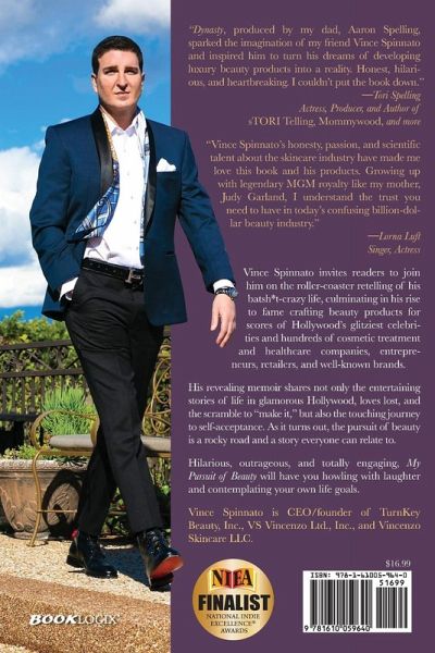 "Finalist, LGTBQ Non-Fiction Category, 15th Annual National Indie Excellence Awards" ¿ REVIEWS "'Dynasty,' produced by my dad, Aaron Spelling, sparked the imagination of my friend, Vince Spinnato, and inspired him to turn his dreams of developing luxury beauty products into a reality. His no-holds-barred memoir describing his struggles to the top is brutally honest, hilarious and heartbreaking. I couldn't put the book down." -Tori Spelling, actress/author of "sTori Telling" "Vince's honesty and his scientific talent about the skincare industry has made me love this book and his products. Growing up with the legendary iconic faces of MGM royalty like my mother, Judy Garland, I understand the trust you need to have in today's confusing billion-dollar beauty industry. When you find the right 'wizard' you are grateful and stay connected." -Lorna Luft, singer/actor, "The New York Times" bestselling author of "A Star is Born: The Film That Got Away" and five-time Emmy award-winning producer of the mini-series "Judy Garland: Me and My Shadow" "As a beauty professional and founder of the largest 'meeting and discussing' book club in the world, I knew from the first chapter that this was from a perspective of creating 'beauty' that I had not read before. I flew through the pages. Five Diamonds in the Pulpwood Queen Recommended Reading list. This dazzling gem is the Official 2021 February Pulpwood Queen/Timber Guys Book of the Month Club Selection!" -Kathy L. Murphy, founder of International Pulpwood Queens and Timber Guys Book Reading Nation and author of "The Pulpwood Queen's Tiara Wearing, Book Sharing Guide to Life" DESCRIPTION At age 10, Vince Spinnato watched TV soaps with his grandmother and became enamored with the characters on "The Young and the Restless," who owned a cosmetics firm. He vowed he would follow in their footsteps and chose a name-VS Vincenzo. In his unconventional memoir, Spinnato shares the inner workings of the multi-billion-dollar beauty industry with entertaining tales about creating beauty products and fine fragrances for celebrities including Michael Jordan, Jennifer Lopez, Jessica Simpson, Lindsay Lohan, Gwen Stefani, and many others. Spinnato also shares some of his life's most bizarre situations: the time he survived a tornado in Iowa while being tethered to a bridge; another when he became stuck inside a resort water slide that involved melted butter and a rescue by the fire department; an embarrassing meetup with film star Lauren Bacall; and his terrifying flight post 9/11 that was nearly shot down by fighter pilots. Transforming himself into a well-known serial entrepreneur and beauty industry expert was no small feat. Along the way, Spinnato dealt with incessant bullying, coming out, dyslexia, body dysmorphia, trichotillomania, and multiple betrayals. "A devastating breakup was the last straw," he says. "At age 20, I got in my car, waved goodbye to New Jersey and headed to Hollywood, determined to launch my career." He eventually founded TurnKey Beauty, Inc., to develop beauty and personal care products for celebrities, as well as major retailers (more than 300 products and counting). A contributor to "Vogue," "Vanity Fair," "Harper's Bazaar," "W," "Esquire," and "GQ," the cosmetic chemist founded Aegean Skincare, LLC and Vincenzo Skincare, LLC. In "My Pursuit of Beauty," Spinnato not only reveals behind-the-scenes tales of working with the rich and famous, searing stories of loves lost, and his scramble to make it, but also his moving journey to self-acceptance.