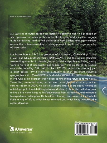 My Quest is an autobiographical sketch of a common man who, plagued by schizophrenia and other problems, battles to gain (and sometimes regain) a life worth living--and to find deliverance from demons and enjoy ultimate redemption; a true account, an evolving personal profile and saga spanning 65 years plus.
