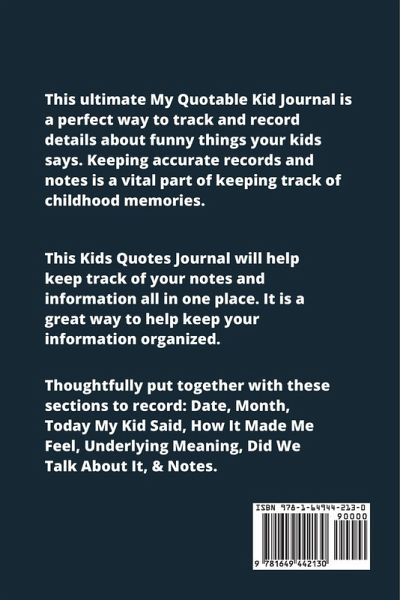 My Quotable Kid memory book is perfect for parents who never want to forget all those hilarious little words or cute sayings that their kid said. Will make a great family keepsake for you to look back on & read over the years. If you have a quotable kid, this is a fun & perfect way to keep those different & memorable quotes all in one place. Make sure you write it all down so your kids can read it when they get older & have a good laugh. Each page includes prompt writing for: Date, Month Today My Kid Said How It Made Me Feel Underlying meaning Did We Talk About It Notes Those moments are precious. Journals & notebooks are a great way in keeping it all safe. Can make a thoughtful gift for any parent. Reliable. Easy to use. Made & designed for parents for writing their child's funny experience. Size is 6x9 inches, 94 pages, quality white paper, soft matte finish cover, paperback. Grab one today!