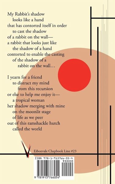 My Rabbit's shadowlooks like a handthat has contorted itself in orderto cast the shadowof a rabbit on the wall-a rabbit that looks just likethe shadow of a handcontorted to enable the castingof the shadow of arabbit on the wall... I yearn for a friendto distract my mindfrom this recursionor else to help me enjoy it-a tropical womanher shadow merging with mineon the moonlit stageof life as we peerout of this ramshackle hutchcalled the world