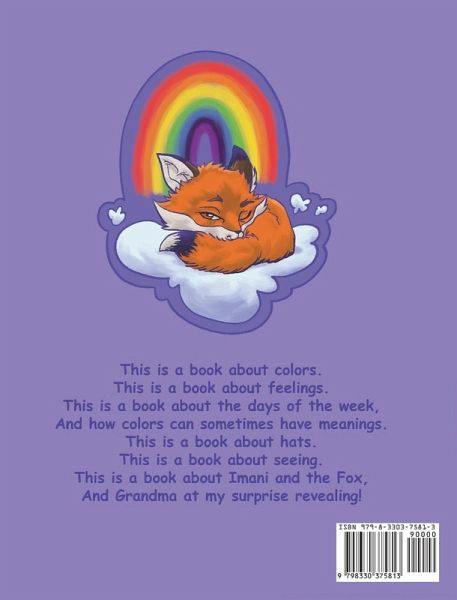 This is a book about colors. This is a book about feelings. This is a book about the days of the week, And how colors can sometimes have meanings. This is a book about hats. This is a book about seeing. This is a book about Imani and the Fox, And Grandma at my surprise revealing!