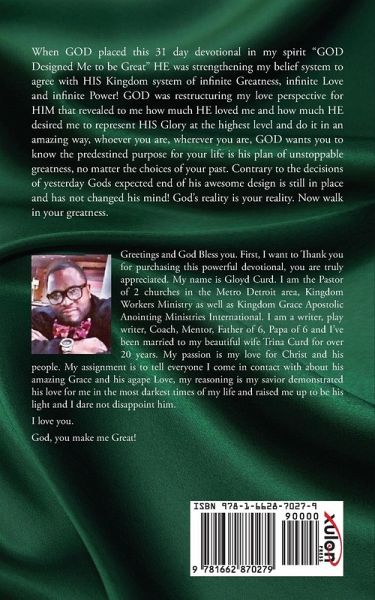 When GOD placed this 31 day devotional in my spirit "GOD Designed Me to be Great" HE was strengthening my belief system to agree with HIS Kingdom system of infinite Greatness, infinite Love and infinite Power! GOD was restructuring my love perspective for HIM that revealed to me how much HE loved me and how much HE desired me to represent HIS Glory at the highest level and do it in an amazing way, whoever you are, wherever you are, GOD wants you to know the predestined purpose for your life is his plan of unstoppable greatness, no matter the choices of your past. Contrary to the decisions of yesterday Gods expected end of his awesome design is still in place and has not changed his mind! God's reality is your reality. Now walk in your greatness. Greetings and God Bless you. First, I want to Thank you for purchasing this powerful devotional, you are truly appreciated. My name is Gloyd Curd. I am the Pastor of 2 churches in the Metro Detroit area, Kingdom Workers Ministry as well as Kingdom Grace Apostolic Anointing Ministries International. I am a writer, play writer, Coach, Mentor, Father of 6, Papa of 6 and I've been married to my beautiful wife Trina Curd for over 20 years. My passion is my love for Christ and his people. My assignment is to tell everyone I come in contact with about his amazing Grace and his agape Love, my reasoning is my savior demonstrated his love for me in the most darkest times of my life and raised me up to be his light and I dare not disappoint him. I love you. God, you make me Great!