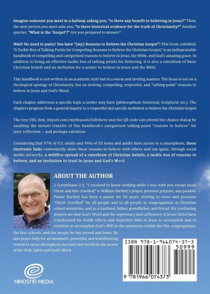 Imagine someone you meet in a hallway asking you, "Is there any benefit to believing in Jesus?" Then, the next person you meet asks you, "Is there historical evidence for the truth of Christianity?" Another queries, "What is the 'Gospel'?" Are you prepared to answer? Wait! No need to panic! You have "(my) Reasons to Believe the Christian Gospel"! This book, subtitled, "A Tackle Box of Talking Points for Compelling Reasons to Believe the Christian Gospel," is an indispensable handbook of compelling and categorized reasons to believe in Jesus, the Bible, and God's amazing grace. In addition to being an effective tackle box of talking points for believing, it is also a catechism of basic Christian beliefs and an invitation for a seeker to believe in Jesus and the Bible. This handbook is not written in an academic style but in a warm and inviting manner. The focus is not on a theological apology of Christianity, but on inviting, compelling, respectful, and "talking-point" reasons to believe in Jesus and God's Word. Each chapter addresses a specific topic a seeker may have (philosophical, historical, Scriptural, etc.). The chapters progress from a general inquiry to a respectful and specific invitation to believe the Christian Gospel. The tiny URL link, tinyurl.com/myReasonsToBelieve and the QR code can extend the chance dialog by enabling the instant transfer of this handbook's categorized talking-point "reasons to believe" for later reflection -- and perhaps salvation. Considering that 97% of U.S. adults and 94% of US teens and adults have access to a smartphone, these electronic links conveniently share these reasons to believe with others and can ignite, through social media networks, a wildfire-spread of a catechism of Christian beliefs, a tackle box of reasons to believe, and an invitation to trust in Jesus and God's Word.