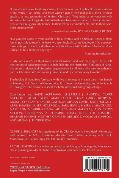 ""From church pews to library carrels, from the tear gas of political demonstrations to the wails of an infant, and from writer's pen to elevated pulpit, these women speak to a new generation of feminist Christians. They invite a conversation with sister-travelers seeking to be faithful to themselves, to each other, to their communities, to their religious inheritance, to their feminist commitments, and to their best, most creative work."" --from the Foreword by Rita Nakashima Brock ""Do you feel alone in your search to be a feminist and a Christian? Does it often feel impossible to reconcile these two seemingly disparate ideologies? Do you ever have feelings of doubt or disillusionment about your faith tradition? And what does it mean to be a feminist anyway?"" --from the Introduction In My Red Couch, 24 third-wave feminist women and one man, ages 18-36, tell their stories of seeking to reconcile their faith and their feminism. This book of narrative essays and practical discussion suggestions is for all those who seek an authentic path of Christian faith and social justice defined by contemporary feminism. The book is divided into four parts with five or six essays in each part: 1) In Search of Integrity; 2) In Search of Community; 3) In Search of Creativity; and 4) In Search of Tensegrity. The resource is ideal for both individual and group settings. Contributors are: Sadie Ackerman, Elizabeth J. Andrew, Claire Bischoff, Laurie Brock, Mary Lousie Bozza, Carol Brorsen, Adam J. Copeland, Rachel Gaffron, Megan Gavin, Katie Haegele, April Heaney, Janet Holbrook, Sara Irwin, HyeRan Kim-Cragg, Mary Ann McKibben Dana, Monica Ann Maestras, Ann Crews Melton, Christiana Z. Peppard, Kelsey Rice, Ellie Roscher, Heather Scheiwe, Heather Grace Shortlidge, Monique Simpson, and Megan J. Thorvilson.