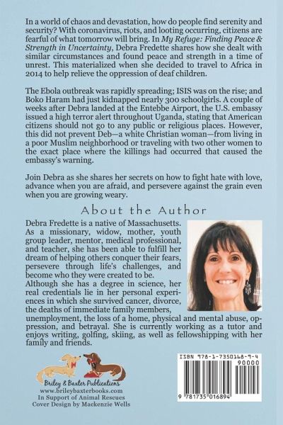 In a world of chaos and devastation, how do people find serenity and security? With coronavirus, riots, and looting occurring, citizens are fearful of what tomorrow will bring. In My Refuge: Finding Peace & Strength in Uncertainty, Debra Fredette shares how she dealt with similar circumstances and found peace and strength in a time of unrest. This materialized when she decided to travel to Africa in 2014 to help relieve the oppression of deaf children. The Ebola outbreak was rapidly spreading; ISIS was on the rise; and Boko Haram had just kidnapped nearly 300 schoolgirls. A couple of weeks after Deb landed at the Entebbe Airport, the U.S. embassy issued a high terror alert throughout Uganda, stating that American citizens should not go to any public or religious places. However, this did not prevent Deb-a white Christian woman-from living in a poor Muslim neighborhood or traveling with two other women to the exact place where the killings had occurred that caused the embassy's warning. Join Deb as she shares her secrets on how to fight hate with love, advance when you are afraid, and persevere against the grain even when you are growing weary.