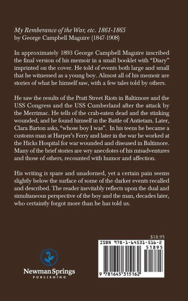 My Remberance of the War, etc. 1861-1865 by George Campbell Maguire (1847-1908) In approximately 1893 George Campbell Maguire inscribed the final version of his memoir in a small booklet with "Diary" imprinted on the cover. He told of events both large and small that he witnessed as a young boy. Almost all of his memoir are stories of what he himself saw, with a few tales told by others. He saw the results of the Pratt Street Riots in Baltimore and the USS Congress and the USS Cumberland after the attack by the Merrimac. He tells of the crab-eaten dead and the stinking wounded, and he found himself in the Battle of Antietam. Later, Clara Barton asks, "whose boy I was". In his teens he became a customs man at Harper's Ferry and later in the war he worked at the Hicks Hospital for war wounded and diseased in Baltimore. Many of the brief stories are wry anecdotes of his misadventures and those of others, recounted with humor and affection. His writing is spare and unadorned, yet a certain pain seems slightly below the surface of some of the darker events recalled and described. The reader inevitably reflects upon the dual and simultaneous perspective of the boy and the man, decades later, who certaintly forgot more than he has told us.
