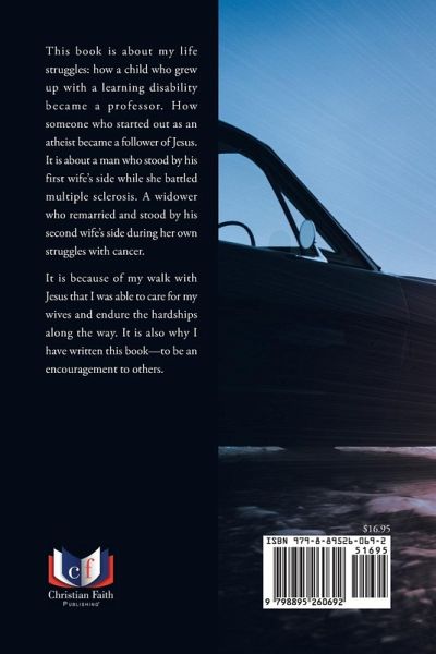 This book is about my life struggles: how a child who grew up with a learning disability became a professor. How someone who started out as an atheist became a follower of Jesus. It is about a man who stood by his first wife's side while she battled multiple sclerosis. A widower who remarried and stood by his second wife's side during her own struggles with cancer. It is because of my walk with Jesus that I was able to care for my wives and endure the hardships along the way. It is also why I have written this book--to be an encouragement to others.