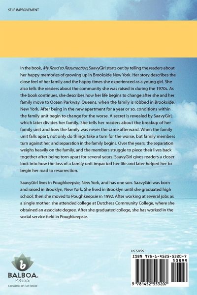 In the book, My Road to Resurrection, SaavyGirl starts out by telling the readers about her happy memories of growing up in Brookside New York. Her story describes the close feel of her family and the happy times she experienced as a young girl .She also tells the readers about the community she was raised in during the 1970s. As the book continues, she describes how her life begins to change after she and her family move to Ocean Parkway, Queens, when the family is robbed in Brookside, New York. After being in the new apartment for a year or so, conditions within the family unit begin to change for the worse. A secret is revealed by SaavyGirl, which later divides her family. She tells her readers about the breakup of her family unit and how the family was never the same afterward. When the family unit falls apart, not only do things take a turn for the worse, but family members turn against her, and separation in the family begins. Over the years, the separation weighs heavily on the family, and the members struggle to piece their lives back together after being torn apart for several years. SaavyGirl gives readers a closer look into how the loss of a family unit impacted her life and later helped her to begin her road to resurrection.