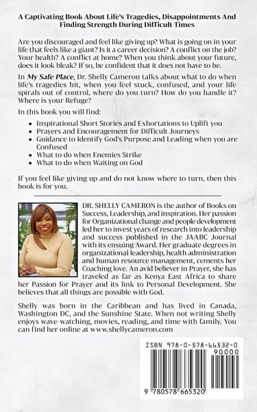 A Captivating Book About Life's Tragedies, Disappointments And Finding Strength During Difficult Times Are you discouraged and feel like giving up? What is going on in your life that feels like a giant? Is it a career decision? A conflict on the job? Your health? A conflict at home? When you think about your future, does it look bleak? If so, be confident that it does not have to be. In My Safe Place, Dr. Shelly Cameron talks about what to do when life's tragedies hit, when you feel stuck, confused, and your life spirals out of control, where do you turn? How do you handle it? Where is your Refuge? In this book you will find: · Inspirational Short Stories and Exhortations to Uplift you · Prayers and Encouragement for Difficult Journeys · Guidance to Identify God's Purpose and Leading when you are Confused · What to do when Enemies Strike · What to do when Waiting on God If you feel like giving up and do not know where to turn, then this book is for you.